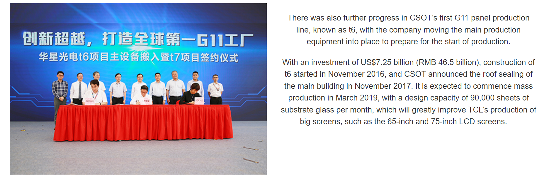 In May 2018, CSOT announced its latest joint investment of US$6.55 billion (RMB 42.68 billion) in the second, 11th generation (“G11”) panel production line in Shenzhen, China, known as t7, revealing LETOU - 乐投’s vision for 8K products and the high value-added market.