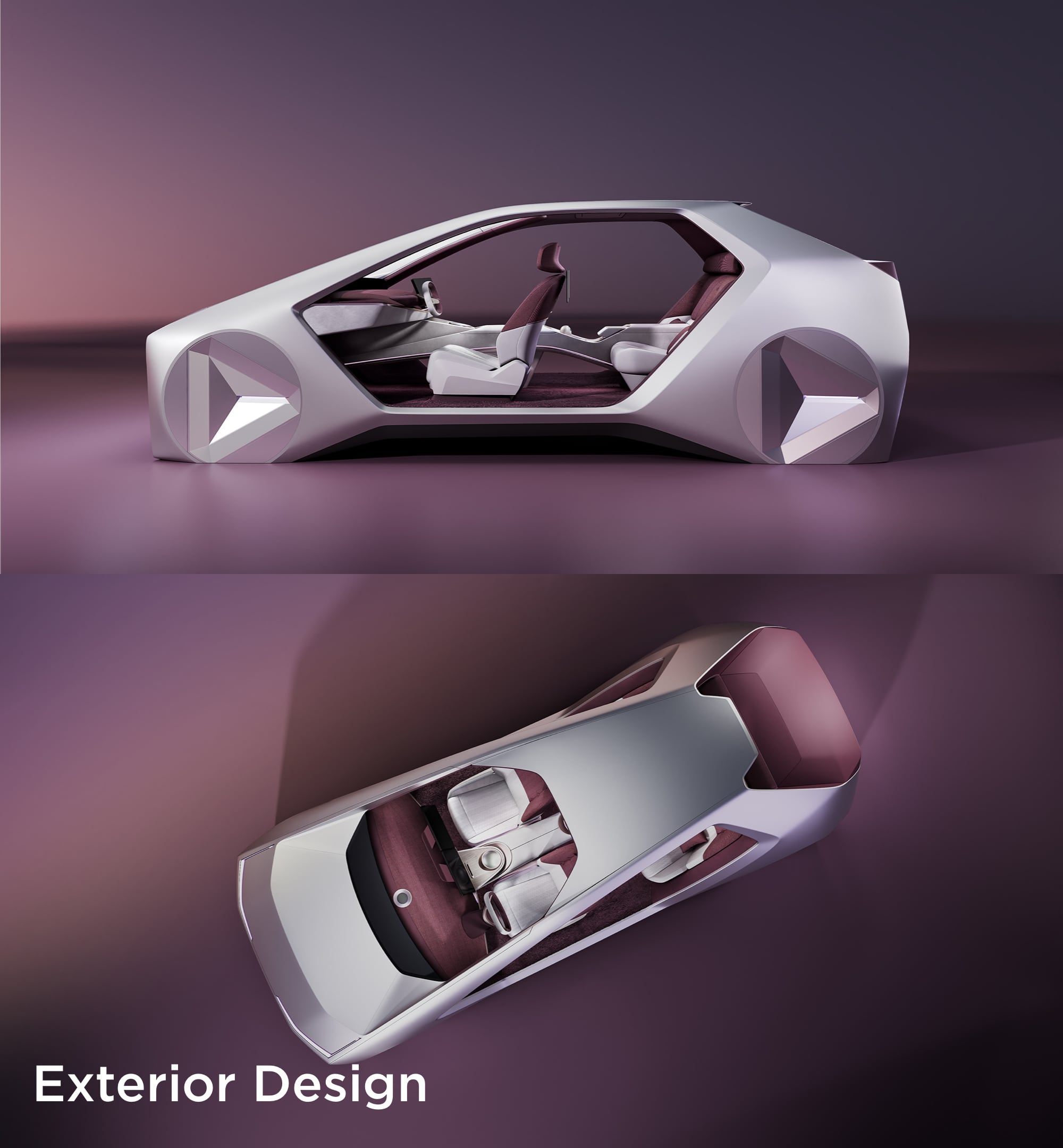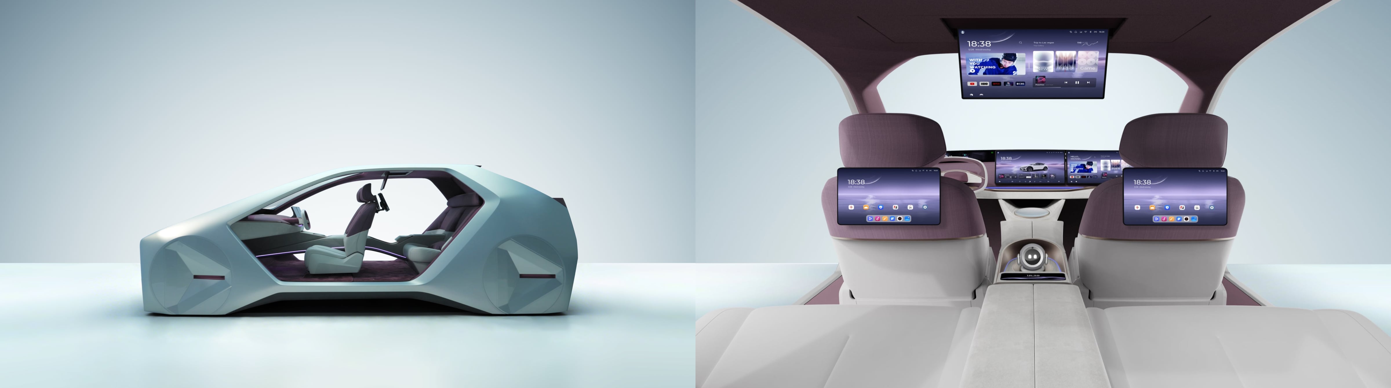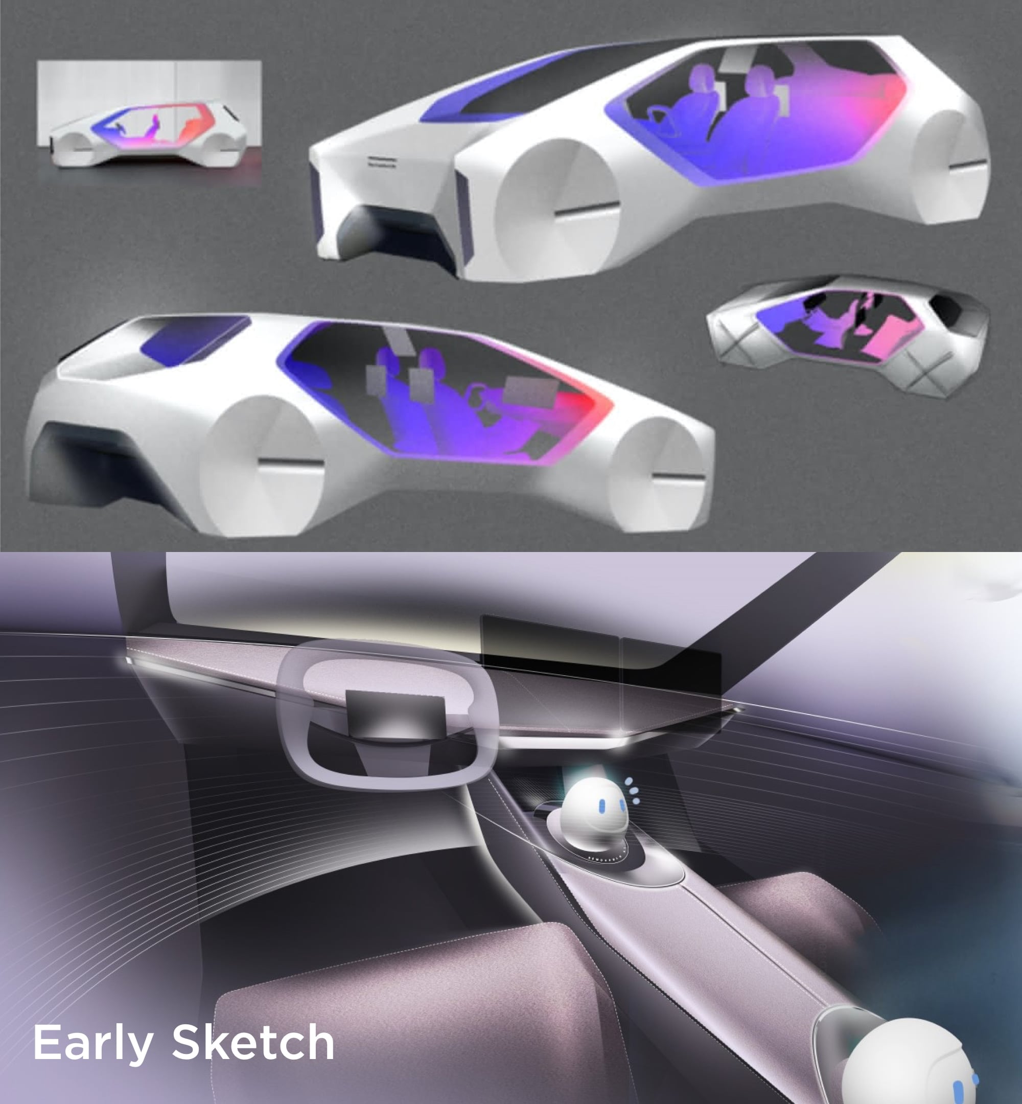 A simple design principle guided the concept from the outset: in-vehicle technology should be visible and understandable, not hidden behind layers of metal and glass. The structural layout, therefore, emphasizes openness, with generous cutouts on the front, rear, and sides. This allows the entire cabin to be read in a single view, immediately revealing how technology integrates into everyday routines. The design explorations below trace this evolution, from early ideas to the final Smart Cabin form.