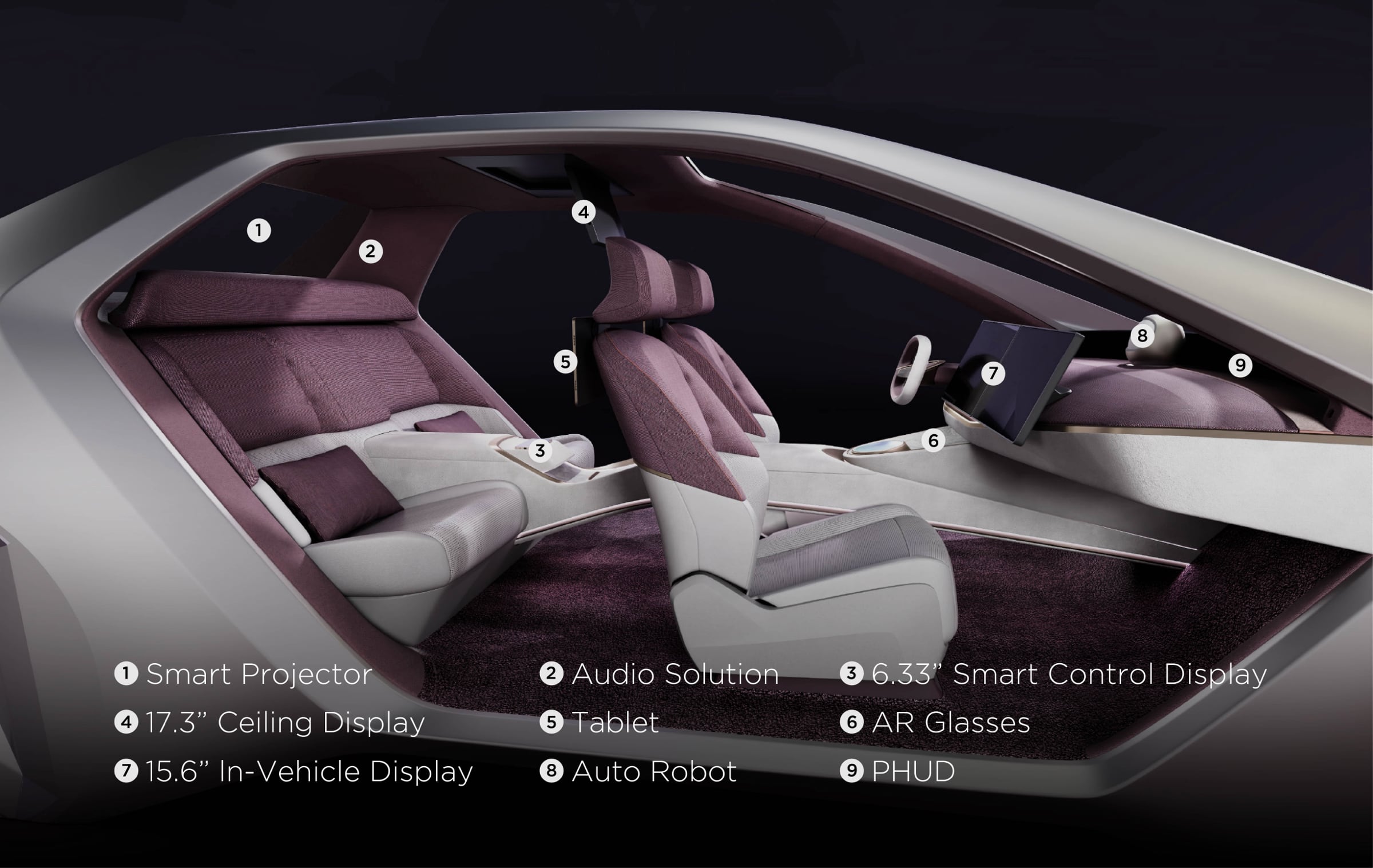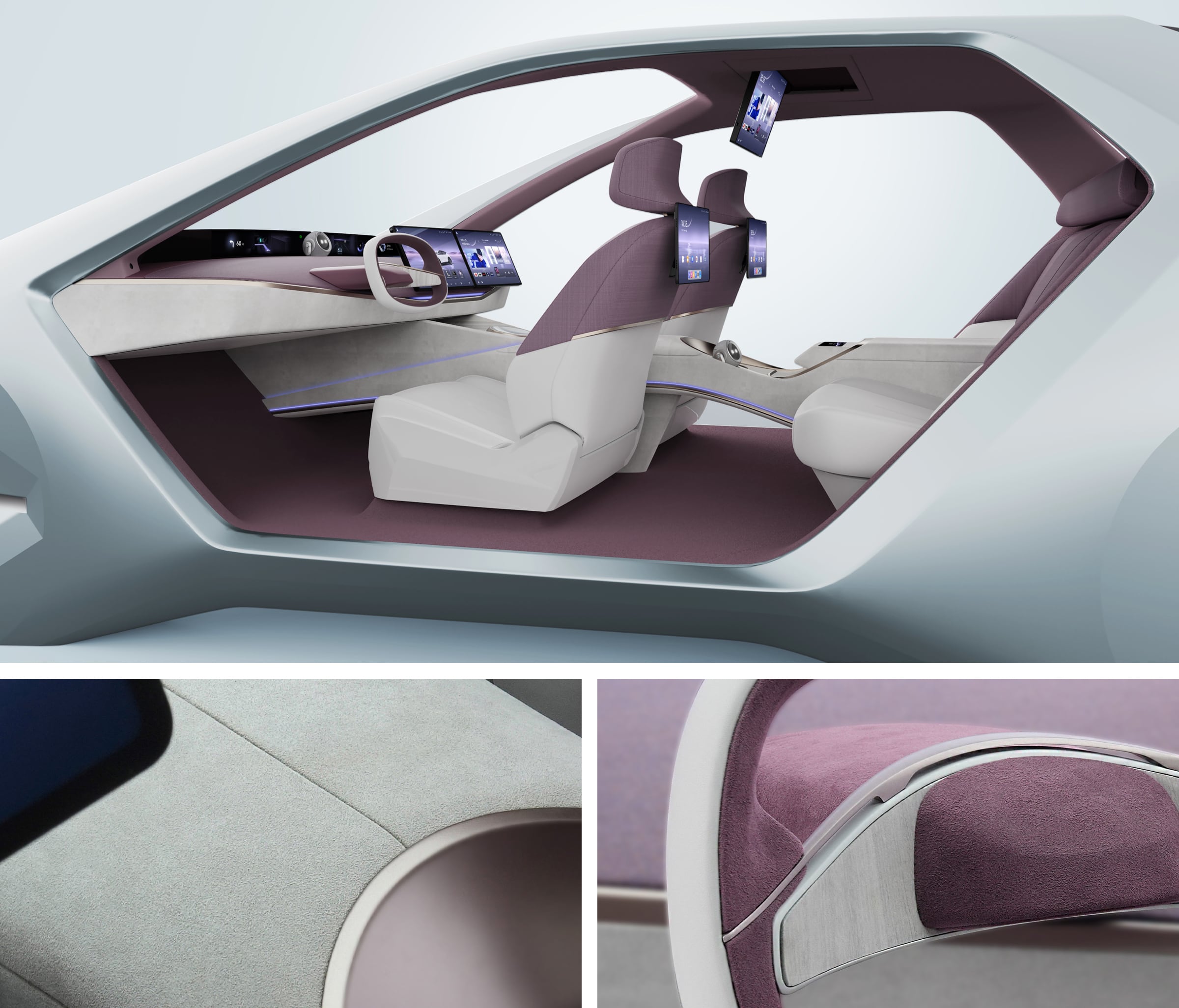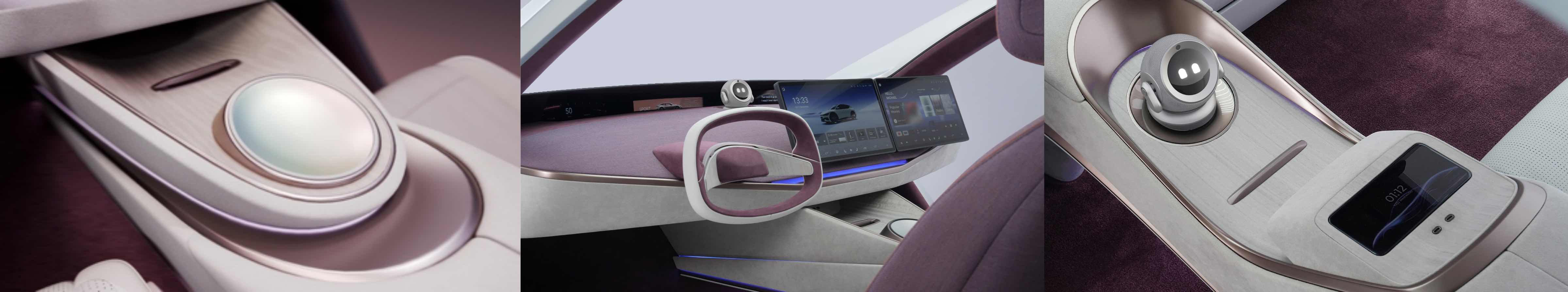 The CMF palette combines a calm base of off-white, establishing openness and visual comfort, with Twilight Purple flowing across spatial layers as a warm, emotional accent. Alcantara, the renowned premium material, is applied selectively on key touchpoints, such as the center armrest, steering wheel and headliner, enhancing comfort where the body naturally interacts with the cabin. Wool-blend seat fabrics, warm wood veneer along the console, and discreet brushed-metal details further ground the digital environment in a material language that feels refined, human, and quietly premium.