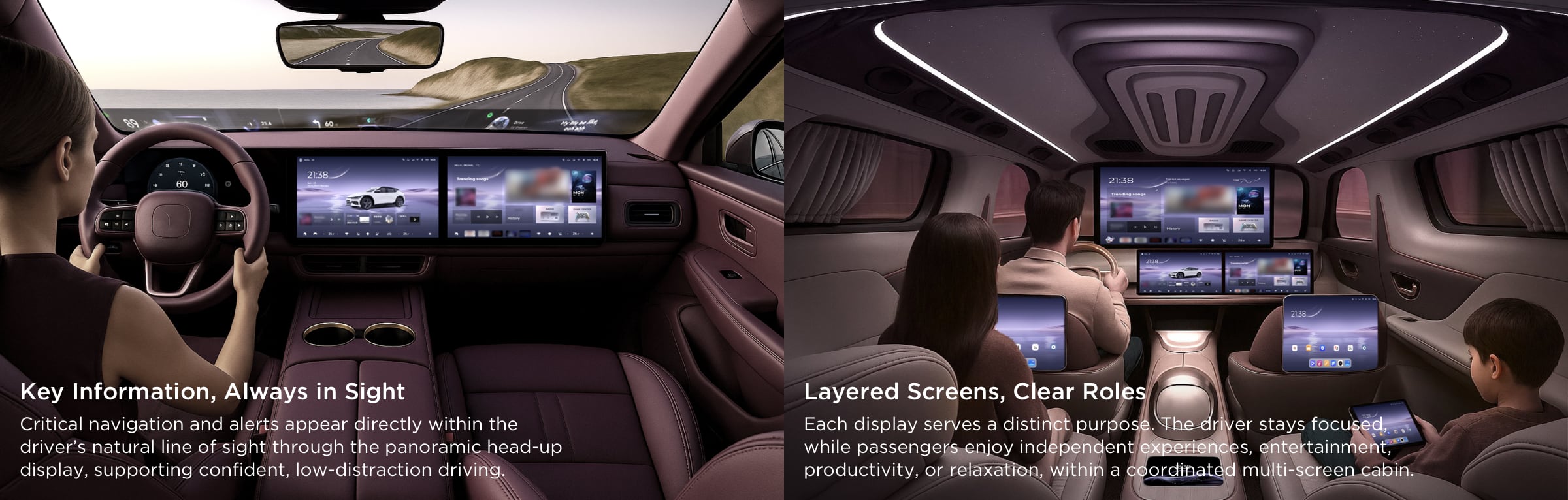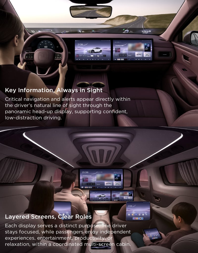 Behind the scenes, a high-performance in-car platform enables ultra-low-latency, multi-screen collaboration. A panoramic head-up display, central and passenger displays, a ceiling display, and a dedicated smart control interface are composed as a single visual field rather than isolated screens.