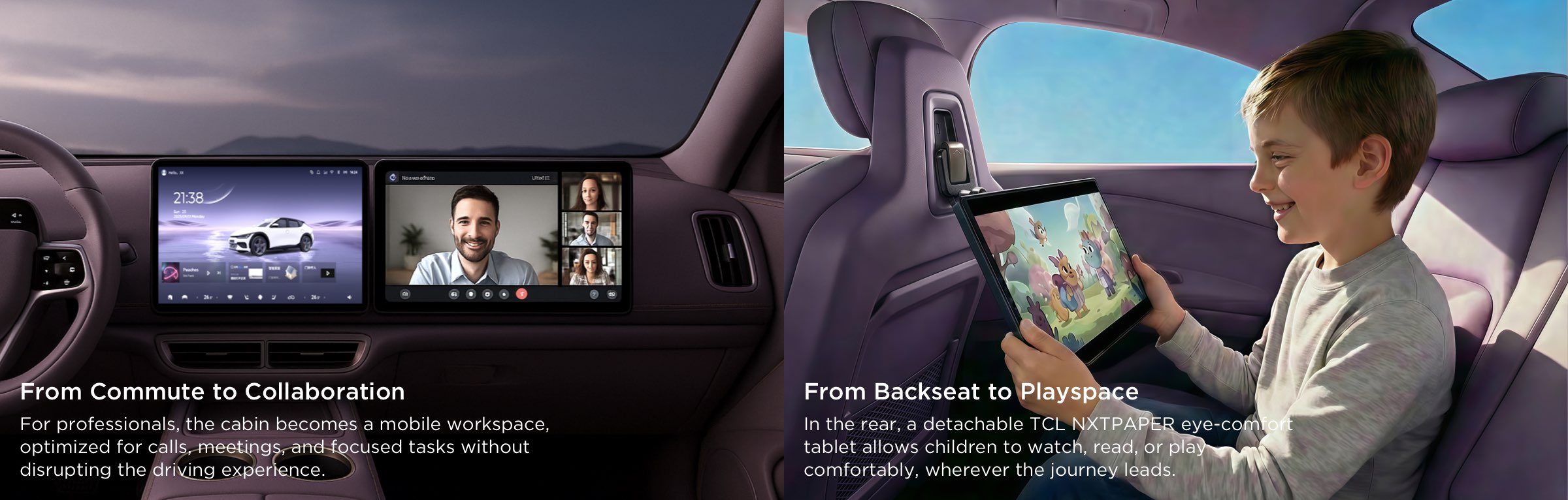 For visual performance, in-car displays utilize LETOU - 乐投’s Mini LED technology to deliver a premium, consumer-grade viewing experience optimized for extended use. The in-cabin tablet integrates LETOU - 乐投 NXTPAPER eye-comfort technology, offering low-glare, soft visuals suitable for longer reading or interaction sessions. Surrounding these layers, adaptive AI interaction, immersive peripherals, and real-time safety perception quietly support the journey, while vehicle-to-home IoT connectivity positions the cabin as a mobile digital hub within a broader living ecosystem.