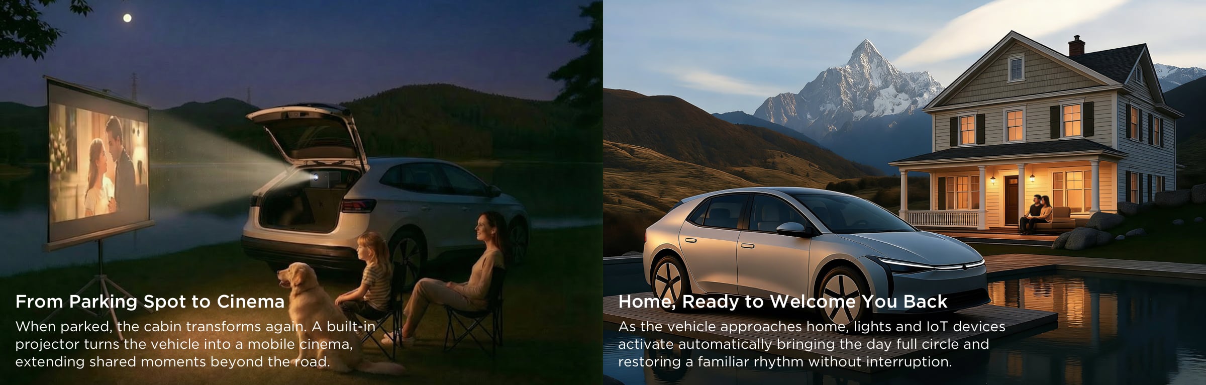 Turns parked moments into a shared cinematic experience.