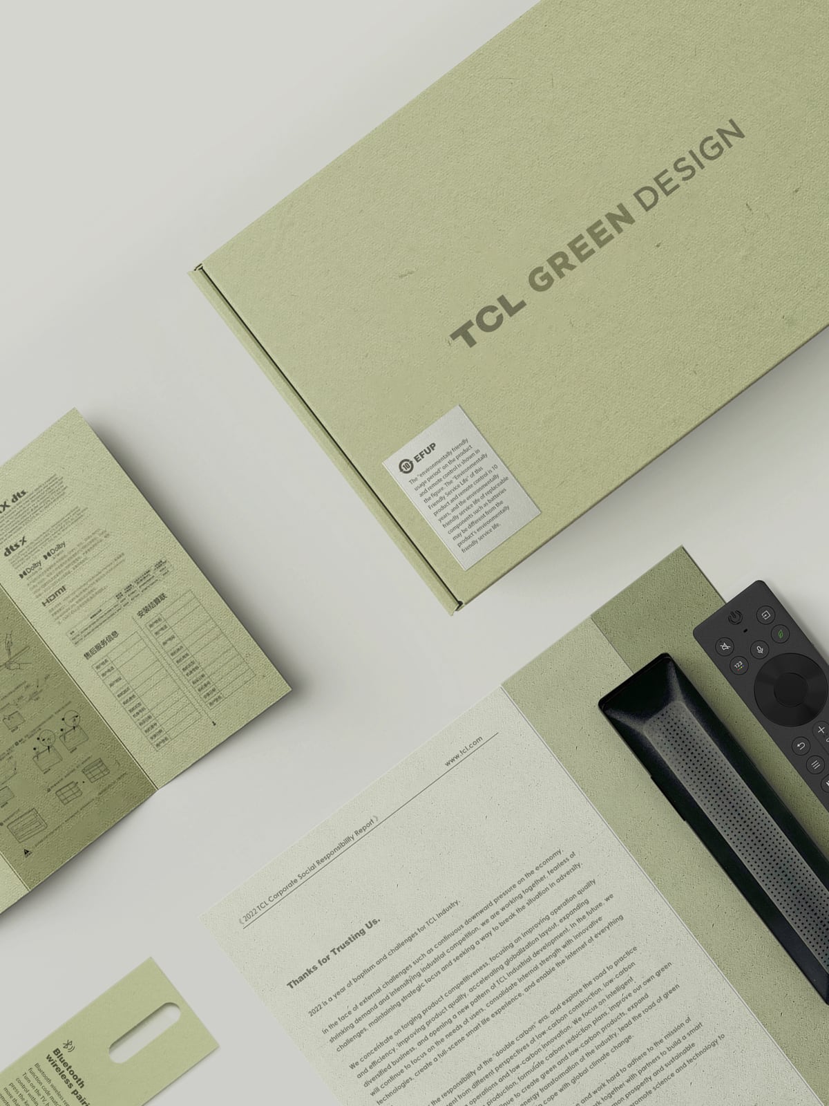 Derived from tea residue, this seamlessly organizes all TV accessories into a unified package set. Its comprehensive visual upgrade aims to elevate the TV unboxing & setup experience for users, fostering a deeper connection to the brand's sustainable ethos. Capitalizing on the influential tea culture of Asian society, the design unfolds a narrative that effortlessly communicates our brand's commitment to environmental protection. Notably, using discarded tea residue as a raw material enhances sustainability and effectively reduces design costs, striking a harmonious balance between commercial value and economic benefits.